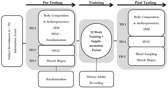 Flow chart describing the experimental design. Pre- and post-testing consisted of three test days (TD1–3) separated by a 12-week intervention period with collagen or placebo supplementation each day and hypertrophy resistance training three days per week. MViC: Maximal voluntary isometric contraction; RM: Repetition Maximum.
