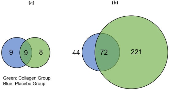 Venn diagrams showing different numbers of (a) significantly downregulated and (b) upregulated proteins in the placebo (blue) and collagen (green) groups after 12-week resistance exercise training and supplementation. The intersection represents proteins that were regulated in both groups.