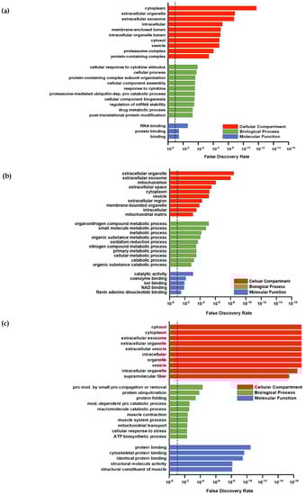 Higher abundant proteins in the intersection (Figure 2b) were assigned to GO categories often found in response to resistance training. For example, upregulated proteins in the GO category “biological processes” (Figure 3a) included the response to cytokines or protein modifications, which are in line with other study outcomes [,]. No subclass of the aspects “molecular functions” and “cellular components” showed specific categories associated with skeletal muscle. Upregulated proteins in PLA showed no direct association with the skeletal muscle system, although the upregulated proteins in PLA in the biological processes category that could be classified into organonitrogen compound metabolic processes and nitrogen compound metabolic processes indicated some responses to an amino acid stimulus (Figure 3c).