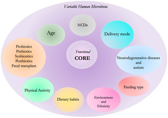 Age is another factor that influences the composition of the human microbiota. At birth, the variability of the microbiota is lower because the diet is solely comprised of the mother’s milk. With time and the introduction of an ample variety of foods, the human microbiota adapts by varying and increasing its bacterial composition in order to metabolize as many foods as possible [37].