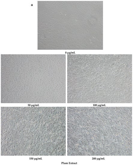 Muscles cells were grown in a 96-well plate for 24 h in 100 μL complete media. Cells were then treated with 0, 50, 100, 150, and 200 μg/mL of extract for 48 h to evaluate a dose-response effect of plum extract. After incubations, the cells were observed under a microscope and pictures (100 × magnification) were taken using a Nikon microscope with calibrated objectives. The size of cells was determined using Element-BR software (Nikon Instruments Inc, Melville, NY, USA).