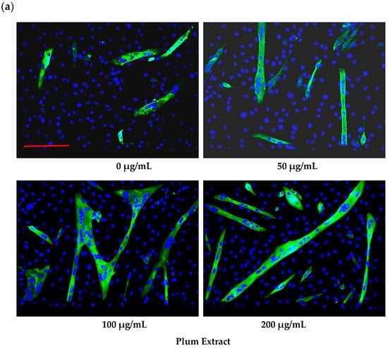 Plum extract had no cytotoxic effect on myoblast when used even at a high dose of 250 μg/mL (data not shown). It is evident from images that plum extract has some effect on cell proliferation; however, it was interesting to note that the plum extract increased the size of undifferentiated myoblasts cells in a dose-dependent manner (Figure 1a). The size of myoblast increased ~two-fold (p < 0.05) after treating cells with 50 μg/mL of plum extract when compared to that of untreated-control cells. Increase in myoblast size plateaued to a maximum increase of three-fold at 200 μg/mL concentration (Figure 1b). The effect of plum extract was also assessed on myoblast differentiation. Figure 2a indicates that the plum extract stimulated differentiation of myoblast in a dose-dependent manner using expression of myosin heavy chain as a marker for differentiation. The number of myotubes formed resulting from fusion of differentiated cells was increased by two-fold in cells treated with 100 μg/mL plum extract (p < 0.05) and by three-fold at 200 μg/mL (p < 0.05) compared to that of control cells (Figure 2b).