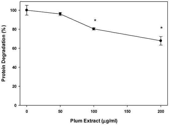 We also examined if plum extract could reduce myotubule protein degradation induced by serum starvation. Figure 4 revealed that plum extract did inhibit protein degradation in a dose-dependent manner. Doses of 100 μg/mL and 200 μg/mL significantly inhibited protein degradation by 20% and 30%, respectively (p < 0.05).