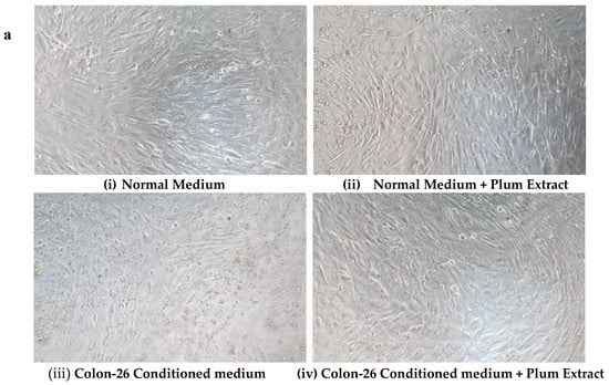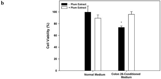 Mouse derived Colon-26 adenomacarcinoma cells are known to induce muscle wasting in rodents [40]. The effect of these circulating soluble factors released by Colon-26 was examined on growth of C2C12 myotubules in vitro in presence or absence of plum extract. Figure 8a,b shows that in the absence of plum extract, soluble factors released in media derived from Colon-26 cells caused a significant reduction of C2C12 cell viability by ~25% (p < 0.05). However, in the presence of plum extract, the negative effects of Colon-26-derived media on C2C12 viability was prevented and the cell viability was maintained to a similar level that was seen in the untreated cells.