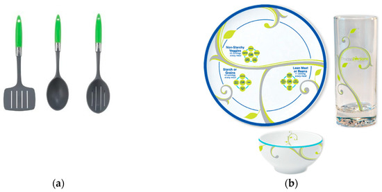 The portion-control tool sets were a set of serving utensils and a set of crockery tableware (Figure 1). These tools were selected based on the results of a previous literature and expert consultation, as well as from an anonymous survey amongst 66 individuals with obesity (BMI > 35 kg/m2) attending weight management services in the same community [22]. The consultation process suggested that for portion-control tools to be effective they need to be versatile across a range of foods, culturally acceptable, easy to use, resistant to wear and tear, and correspond with reference portion sizes. These criteria were used to design an anonymous poll where participants ranked four portion-control tool sets meeting the above criteria, in order of preference, after receiving a short demonstration of their use. The four tool sets included an all-in-one portion pot [30], a color-coded measuring portion pot and a measuring spoon set [17,31], plus the crockery and the serving spoons sets (Figure 1) [18,19], which were the two tool sets which were ranked highest. For the present study, both tools were accompanied by a simple set of instructions based on the manufacturer’s information including details of the components of each tool set, correspondence to reference portion sizes, and information on heat resistance and cleaning instructions. Each participant was asked to use each of the tools for a 2-week period, in random order. Participants saw their lifestyle advisor at the start, middle and end of the study period as part of their routine health care visits. To avoid confounding, participants who took part in the initial anonymous poll (n = 66) were excluded from the trial.
