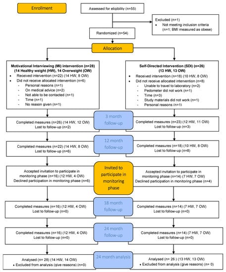 In brief, 54 women were recruited to the 12 month intervention study from the Newcastle region, Australia. Recruitment channels included radio and television interviews, newspaper articles and flyers placed in medical clinics and University notice boards. Those women expressing interest were screened against inclusion criteria (women aged 44–50 years at baseline, with a BMI between 18.5–29.99 kg/m2, menstruated within the preceding three months, and free of major diseases including cardiovascular disease, diabetes and cancer) by telephone interview between May and July of 2010. Women were categorized by BMI as healthy weight (18.5–24.99 kg/m2) or overweight (25.0–29.99 kg/m2), according to their baseline measures, then randomly assigned to the MI or SDI group using computer-generated random number sequences (one list for the healthy weight BMI range and one for the overweight BMI range to stratify the sample). The study was powered for a between group difference of 3.5 kg, assuming equal sample sizes, 80% power, a significance level of 0.05 and 20% attrition over the 24 months. Measures for the intervention phase were collected at baseline, 3 and 12 months, and at 18 and 24 months in the monitoring phase [11]. The CONsolidated Standards of Reporting Trials (CONSORT) diagram showing participation through the 24 month study is shown in Figure 1.