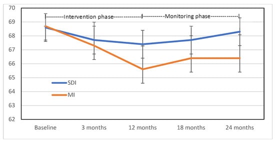 Mean (95% CI) weight (kg) for the Motivational Interviewing (MI) group and the Self-Directed Intervention (SDI) group over 24 months (ITT analysis) (n = 54).