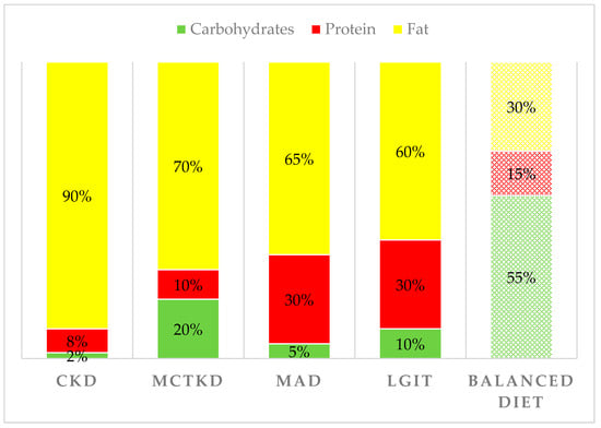 Currently, several KD variants are used in clinical practice: the classic ketogenic diet (CKD), the medium-chain triglyceride ketogenic diet (MCTKD), the modified Atkins diet (MAD), and the low glycemic index treatment (LGIT) [,]. The CKD is the most restrictive diet and is based on the ketogenic ratio (KR), the ratio between the grams of fat and the sum of the grams of proteins and carbohydrates. Today, CKDs aim to achieve a KR of 4:1 (90% of daily calories derive from fat) or 3:1 (87% of daily calories derive from fat). In CKD fat are represented especially by long-chain triglycerides (LCT). Instead, the carbohydrate allowance is very limited, and the proteins are kept to a minimum to satisfy the requirements for growth. In the MCTKD, 30–60% of the energy is derived from medium-chain triglyceride (MCT) oil, which yields more ketone per kilocalorie of energy than LCT, allowing a decrement of total fat and a higher carbohydrate and protein intake, compared to CKD. MAD is characterized by a KR of 1:1 or 2:1 and a carbohydrate intake of up to 20 g/day. Finally, the LGIT allows a carbohydrate intake of 40–60 g/day limited to food with a glycemic index <50 [,]. Figure 1 shows the detailed distribution of macronutrients in the different variants of KD, compared to a balanced diet as recommended by the Italian Society of Human Nutrition [].