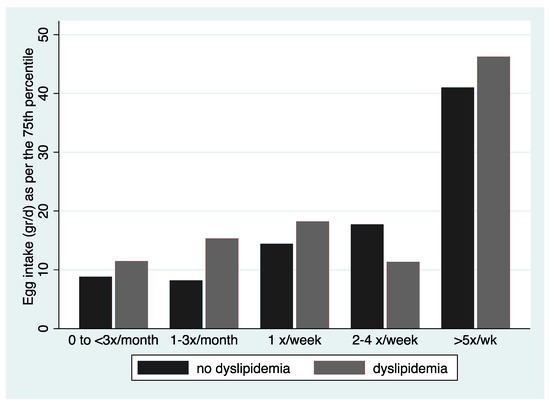 The relation of the 75th percentile of egg intake reported from the two 24-h recalls, over frequency of intake and lipid status is shown in Figure 1. Overall, those reporting higher frequency of intake had also reported a higher consumption during the 24-h recall (excluding dyslipidemics reporting 2–4 times a week).