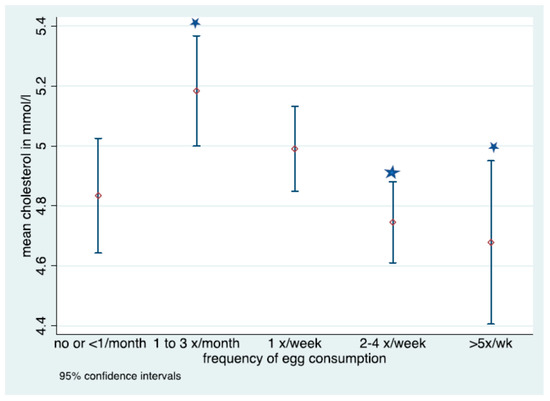 In Figure 2, mean levels of cholesterol with 95% CIs are depicted, showing the distribution of cholesterol levels according to reported frequency of egg consumption. A significantly higher mean serum cholesterol was measured in individuals consuming eggs 1–3 times per month and 2–4 times a week or >5 times a week.