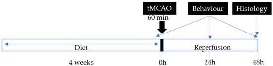 Stroke is one of the leading causes of death worldwide [1] and is a major cause of disability in adults [2]. A stroke occurs when a cerebral blood vessel is disrupted and as a result, the blood supply to a region of the brain is cut-off [3]. The sequence of events responding to ischemia is known as the ischemic cascade, which includes glutamate release, calcium influx, oxidative stress, inflammation, and ultimately, apoptosis, the irreversible loss of cell viability and neuronal death [4,5]. In addition, comorbid conditions, the accumulation of risk factors for stroke, and a western diet, can all exacerbate the subsequent ischemic damage [6,7].