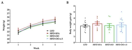 The growth of the mice was analysed while they received each diet by weighing them weekly. After four weeks on the experimental dietary regime, no differences in body weight (Figure 2A) or gains in body weight (Figure 2B) were found between the mice in the LFD, HFD-SFA, HFD-OO, or HFD-OO-ω3 groups.