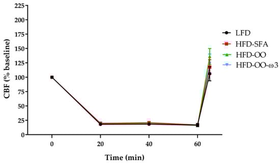 Figure 3. Representation of cerebral blood flow (CBF) traces recorded by laser Doppler flowmetry during the tMCAo procedure. CBF values were recorded continuously during the procedure, analysing the following time intervals: baseline (0 min), 0–20 min, 20–40 min, 40–60 min, and the onset of reperfusion at 60–65 min. Groups: LFD (Black), HFD-SFA (Red), HFD-OO (Green) and HFD-OO-ω3 (Blue). No significant differences between the groups were found (2-way ANOVA), the results represent the mean ± SEM of 8 to 10 animals. Low-fat diet (LFD), high-fat diet rich in saturated fatty acids (HFD-SFA), high-fat diet rich in olive oil (HFD-OO), and high-fat diet rich in olive oil plus DHA and EPA (HFD-OO-ω3).