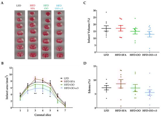 Figure 4. HFD-OO-ω3 diet reduces the infarct area in an experimental model of focal cerebral ischemia. Groups: LFD (Black), HFD-SFA (Red), HFD-OO (Green), and HFD-OO-ω3 (Blue). (A) Representative images of TTC staining. Seven coronal slices along the rostro-caudal axis are shown, from coordinates bregma AP: +2.80 to bregma AP: −2.46 (Franklin and Paxinos atlas [41]). (B) The HFD-OO-ω3 diet reduced the infarct area compared to HFD-SFA and LFD. (C,D) show the Infarct volume and edema analyses, respectively. These data reflect a slight decrease in both parameters, yet no significant differences were found. The results represent the mean ± SEM of 8 to 10 animals: * p ≤ 0.05, ** p ≤ 0.01 versus HFD-SFA and + p ≤ 0.05 versus LFD (ANOVA + Bonferroni post-hoc). Low-fat diet (LFD), high-fat diet rich in saturated fatty acids (HFD-SFA), high-fat diet rich in olive oil (HFD-OO), and high-fat diet rich in olive oil plus DHA and EPA (HFD-OO-ω3).