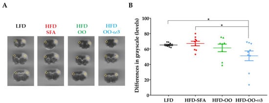 Infarct severity was evaluated by performing a grayscale analysis of the TTC-stained brain sections obtained 48 h after mice were subjected to tMCAo. Mice fed with HFD-OO-ω3 displayed a significant reduction in the grey scale intensity compared to animals fed with HFD-SFA and LFD (Figure 5A,B), revealing a neuroprotective effect of the diet enriched in DHA+EPA and olive oil.