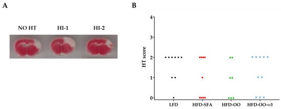 Figure 6. Haemorrhagic transformation analysis. Groups: LFD (Black), HFD-SFA (Red), HFD-OO (Green), and HFD-OO-ω3 (Blue). (A) Representative images of the classes of macroscopic haemorrhages found during the analysis: no haemorrhages (NO HT), haemorrhagic infarction type 1 (HI-1), haemorrhagic infarction type 2 (HI-2). (B) Haemorrhagic transformation score. No significant differences were found between the groups (Kruskal–Wallis + Dunn´s post-hoc). Low-fat diet (LFD), high-fat diet rich in saturated fatty acids (HFD-SFA), high-fat diet rich in olive oil (HFD-OO), and high-fat diet rich in olive oil plus DHA and EPA (HFD-OO-ω3).