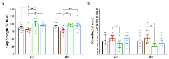 Figure 7. Differences in motor deficits and neurological function in mice fed with HFD-OO or HFD-OO-ω3. Groups: LFD (Black), HFD-SFA (Red), HFD-OO (Green), and HFD-OO-ω3 (Blue). (A) HFD-OO and HFD-OO-ω3 diets improved grip strength 24 and 48 h after reperfusion relative to the LFD or HFD-SFA. Mice belonging to HFD-SFA group displayed less grip strength 48 h after the onset of tMCAo than animals on LFD. (B) HFD-OO-fed mice had better neurological scores 24 and 48 h after reperfusion compared to HFD-SFA-fed or the HFD-SFA and LFD-fed groups, respectively. The results represent the mean ± SEM in A and the median ± interquartile range in B of 6 to 11 animals: * p ≤ 0.05 and ** p ≤ 0.01 (ANOVA + Bonferroni post-hoc were performed in (A) and Kruskal–Wallis + Dunn´s tests were performed in (B)).