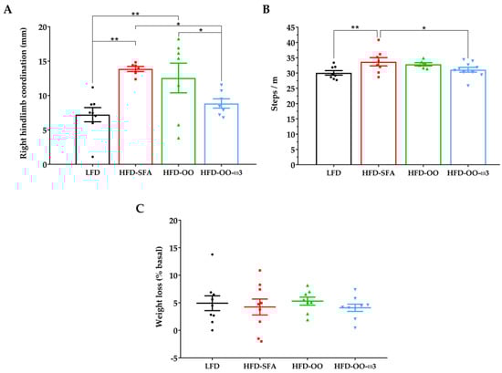 Figure 8. The effect of dietary interventions with a HFD containing a specific fatty acid composition on gait coordination and weight loss. Groups: LFD (Black), HFD-SFA (Red), HFD-OO (Green), and HFD-OO-ω3 (Blue). (A) Mice on a HFD-OO-ω3 and LFD diet had better coordination of the right hindlimb 48 h after reperfusion than those on a HFD-SFA diet. (B) Mice fed with HFD-OO-ω3 or LFD showed better steps/m values than mice fed a HFD-SFA diet. HFD-OO was not as beneficial as HFD-OO-ω3 48 h after the onset of reperfusion. (C) When the weight loss was analysed 48 h after tMCAo, no significant differences were found between the groups. The results represent the mean ± SEM of 6 to 10 mice: * p ≤ 0.05 and ** p ≤ 0.01 (ANOVA + Bonferroni post-hoc). Low-fat diet (LFD), high-fat diet rich in saturated fatty acids (HFD-SFA), high-fat diet rich in olive oil (HFD-OO), and high-fat diet rich in olive oil plus DHA and EPA (HFD-OO-ω3).