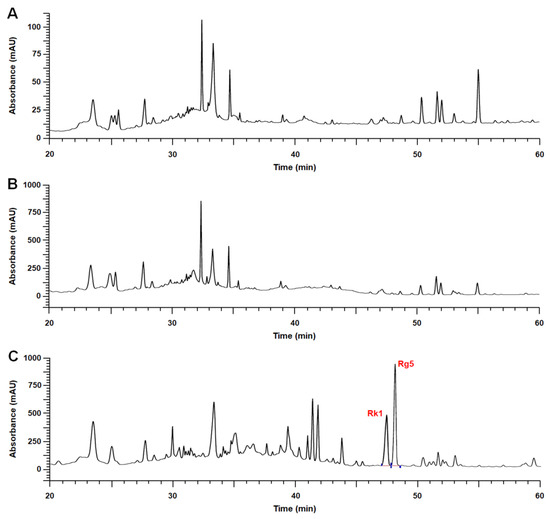 Representative HPLC chromatograms of products analyzed in this study. (A) The raw material (cultured wild ginseng root) and (B) the intermediate product seldom contained ginsenosides Rg5 and Rk1. (C) Concentrations of ginsenosides Rg5 and Rk1 in HLJG0701, the fermented extract of cultured wild ginseng root, were detected as 21.48 and 18.71 mg/g respectively.