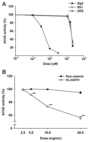 (A) Effect of standard ginsenosides Rg5 and Rk1 on AChE activity. The AChE inhibition rate of Rg5, Rk1 and donepezil (DPZ) was analyzed. Donepezil was used as a positive control. (B) The AChE inhibition rate of HLJG0701 and its raw material was compared. Data are presented as mean ± SEM (n = 3). ** p < 0.01 vs. raw material.