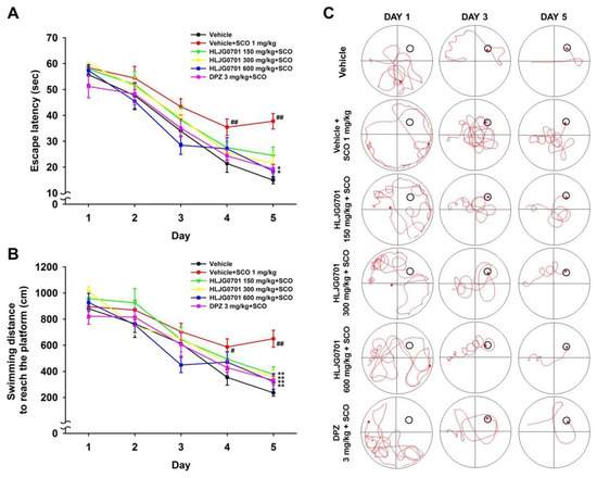 Effect of HLJG0701 on memory deficit in training sessions involving the Morris water maze task. To evaluate the effect of memory improvement, (A) the escape latency and (B) swimming distance to reach the platform were measured in training sessions during 5 consecutive days. Vehicle (control and negative groups, p.o.), HLJG0701 (p.o.), and donepezil (DPZ, positive group, i.p.) were treated and memory impairment was induced by scopolamine (SCO, i.p.). Data are expressed as mean ± SEM (n = 8). # p < 0.05, ## p < 0.01 vs. control group, * p < 0.05, ** p < 0.01 vs. negative group. (C) Representative images tracking the swimming movement on day 1, 3, and 5 in training sessions. The red curve tracks the movement of mice and the last location of mice is marked with the red square. The black circle indicates an escape platform.