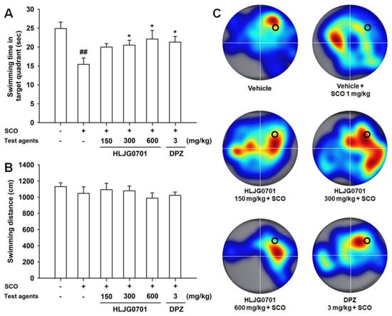 Effect of HLJG0701 on reference memory in probe trial sessions of the Morris water maze task. Mice were allowed to swim in the water tank without a platform for 60 s. (A) Time spent in the quadrant where the platform was previously located was recorded, and (B) the total swimming distance also was measured. Treatment with test agents was the same as described in Figure 4. Data are expressed as mean ± SEM (n = 8). ## p < 0.01 vs. control group, * p < 0.05 vs. negative group. (C) Representative heatmap images of probe trial sessions. The longer the mice spent in each quadrant, the redder is the image displayed. Conversely, a cooler color indicates a shorter duration. The black circle shows the position where the platform was located previously.