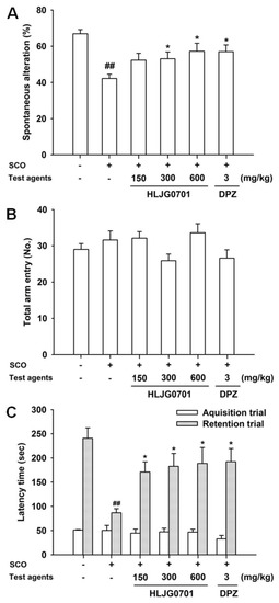 Animals were distributed according to their graded body weights and randomized into six test groups (eight mice per a group) including the control group, negative group, three HLJG0701 dosing groups, and positive group. Control and negative groups were orally treated distilled water as a vehicle and HLJG0701 dissolved in the vehicle was given to mice at doses of 150, 300, and 600 mg/kg by gavage. Donepezil, as a positive control, was injected intraperitoneally. All test agents were administered once a day during three weeks before initiation of behavioral tests. During behavioral tests, all test agents, except the control group, were administered 1 h before each trial and memory impairment was induced by 1 mg/kg of scopolamine (i.p.) at 30 min after treatment with test agents. Scopolamine hydrobromide and donepezil were purchased from (Sigma Aldrich Inc., St. Louis, MO, USA and Jubilant Generics Ltd., Mysore, Karnataka, India), respectively.