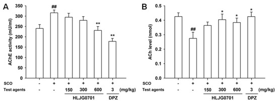 AChE activity and ACh contents were determined in the mouse brain except for the cerebellum. The AChE activity in the negative group was significantly higher than in the control group (p < 0.01). Exposure to HLJG0701 600 mg/kg and donepezil significantly reduced AChE activity, compared with the activity of the negative group (p < 0.01). Only the HLJG0701 600 mg/kg group showed a significant difference, however, AChE activity was decreased in a dose-dependent manner in all HLJG0701-treated groups (Figure 6A). On the other hand, the ACh content showed the opposite trend. Scopolamine treatment resulted in a decline in the ACh level in the negative group as compared with the control group, however, treatment with HLJG0701 and donepezil preserved higher ACh contents than that of the negative group. Moreover, significant differences were observed in the negative group (vs. control group, p < 0.01) as well as the groups exposed to HLJG0701 300 and 600 mg/kg and donepezil (vs. negative group, p < 0.05, Figure 6B).