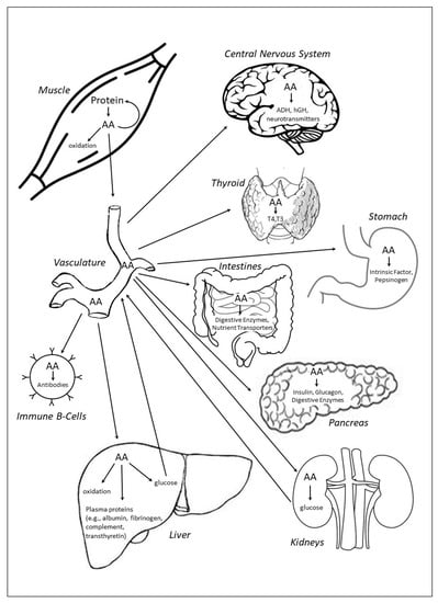 Energy and/or dietary protein restriction induce net muscle catabolism, releasing amino acids for energy production, gluconeogenesis, and synthesis of peptide hormones, plasma proteins, immune system components, and enzymes (representative examples, not an exhaustive list; not drawn to scale). AA, amino acids; ADH, antidiuretic hormone; hGH, human growth hormone; T3, triiodothyronine; T4, thyroxine.