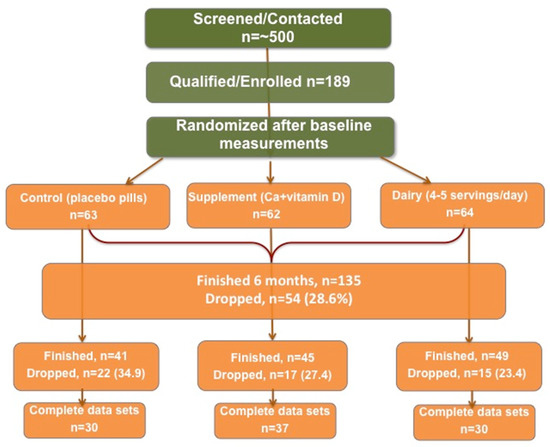 Therefore, our objective was to conduct a weight loss study and investigate whether weight loss and/or improvement in body composition, as well as the preservation of bone mass could be achieved easier with Ca + vitamin D supplements or low-fat dairy foods as complements to hypocaloric diets. We opted for a 6-month intervention study, a period long enough to detect changes in bone and body composition measured by dual energy x-ray absorptiometry (DXA), but not too long to cause diminished compliance and increased attrition rate among participants. We hypothesized that the hypocaloric diets with increased low-fat dairy foods or with Ca + vitamin D supplements, will be associated with greater weight reduction toward a healthier body composition and preservation of bone mass, in comparison to the control group (only hypocaloric diet), with the best outcomes in the low-fat dairy group.