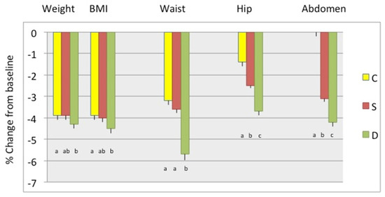Percent change (mean ± SEM) in weight (kg), BMI (kg/m2), waist, hip, and abdominal circumference (cm), respectively, between baseline and 6 months among the groups. Only the complete data sets at baseline and 6-months were used. C-Control/placebo, n = 30; S-Supplement, n = 37; D-Dairy, n = 30. Bars with different letters indicate the statistically significant difference among the groups at 6 months.
