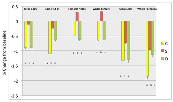 Percent change in bone mineral density (BMD) (mean ± SEM) of various skeletal sites between baseline and 6 months among the groups. Only the complete data sets at baseline and 6-months were used: C-Control/placebo, n = 30; S-Supplement, n = 37; D-Dairy, n = 30 were used for these analyses. BMD presents average values for both (left and right) femoral necks, both whole femurs (neck, Ward’s triangle, trochanter, and shaft), both radius 1/3 of styloid process, and both whole forearms (ulna and radius at ultradistal and 1/3 site). Bars with different letters indicate the statistically significant difference among the groups at 6 months.