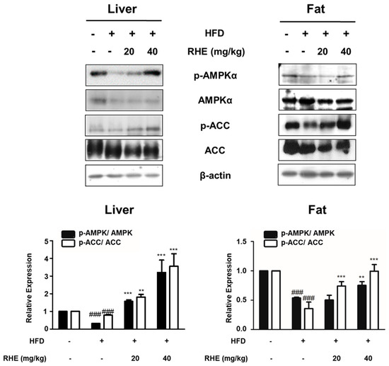 A major function of AMPK is energy homeostasis, and its activation is involved in the regulation of differentiation [7]. ACC, which is one of the target molecules of AMPK, is a necessary enzyme for fatty acids homeostasis [8]. Therefore, we investigated if RHE would regulate adipocyte differentiation and energy metabolism via the regulation of AMPK in liver tissues and epididymis adipose tissues of HFD-fed mice. As shown in Figure 4, western blot analysis revealed that the HFD group showed less phosphorylation of AMPK phosphorylation than the CON group (p < 0.001), but this level was significantly enhanced by administration of RHE (40 mg/kg) in both liver and epididymis adipose tissues (p < 0.001 and p < 0.01). Similarly, the phosphorylation level of ACC, a direct downstream target of AMPK, was significantly reduced by HFD, but was reversed in the HFD+RHE samples. These findings revealed that RHE attenuated obesity though activation of the AMPK pathway.
