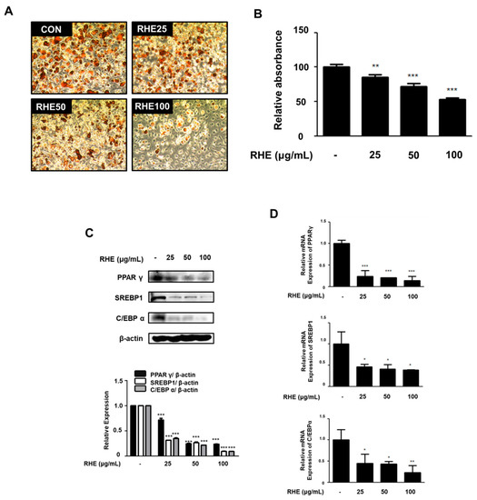 To further confirm the effects of RHE on adipogenesis, 3T3-L1 preadipocytes were treated with different concentrations of RHE (25, 50, and 100 μg/mL) during differentiation. RHE treatment caused a significant reduction in Oil red O-stained adipocytes and fat accumulation in differentiated adipocytes compared to the untreated cells (Figure 6A). These results correlated exactly with the absorbance values of eluted Oil red O staining solution in differentiated cells (Figure 6B, p < 0.01 or p < 0.001). In addition, we analyzed the expression of PPARγ, SREBP1, and C/EBPα using western blot analysis and qRT-PCR analysis in order to investigate whether RHE inhibits the expression of adipogenic factors in MDI-induced 3T3-L1 cells. As shown in Figure 6C,D, the protein and mRNA expression of PPARγ, SREBP1, and C/EBPα was significantly lower than those of the untreated cells.