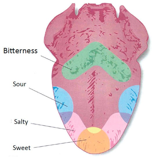 Bitter tastes are triggered by the binding of molecules to G protein-coupled receptors on the cell membranes of taste buds. Tongue and oral epithelium are covered by taste buds composed of about 50 modified epithelial cells, some of which are supporting cells called sustentacular cells and others of which are taste cells. A large number of taste buds surround the circumvallate papillae, which form a “V line” on the surface of the posterior tongue (Figure 1). For the bitter taste sensations, the portions of the receptor protein molecules that protrude through the apical membranes activate second-messenger transmitter substances inside the taste cells, and these second messengers cause intracellular chemical changes that elicit the taste signals [37].