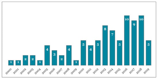 Figure 2 depicts the temporal distribution of the reviewed articles. Although the total number of articles was quite exiguous, there was an increasing trend of papers published in the latest years. This testifies the growing interest of the scientific community toward the topic under investigation in the current review. Nevertheless, the limited number of articles shows the need for further research on specific issues that will hereby be presented.