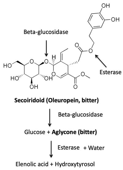 The main biophenolic compounds of olive (Olea europaea) drupe and virgin olive oil are specific of the family of Oleaceae and related to the class of secoiridoid glycosides (oleuropein, ligstroside). When fruit tissues are damaged, beta-glycosidase endogenous enzyme activity releases from these glycosides the glucose moiety and bitter-pungent aglycones [5]. These bitter compounds can be furtherly hydrolyzed by esterase (Figure 3).