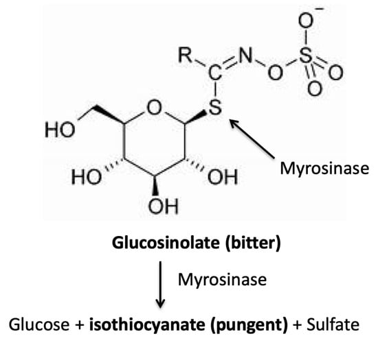 Bitterness is a salient characteristic of the Brassicaceae family [68,94,95]. The main bitter and pungent compounds of Brassicaceae are typical sulfur-containing phytochemicals like glucosinolates present in cell vacuoles and their hydrolysis compounds (isothiocyanates, thiocyanates, and nitriles) formed by the action of the enzyme myrosinase (or thioglucoside glycopyrrolate) when plant tissue is damaged and the cytoplasmatic enzyme can be in contact with glucosinolates [146] (Figure 4).