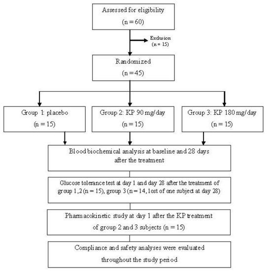 Randomized, double blinded, and placebo control trials were conducted in 45 healthy volunteers (Figure 2). The sample size was 15 per group, which was calculated by using power of 80%, alpha of 0.05, and standardized effect size of 1.05. The clinical study was approved by the Khon Kaen University Ethics Committee in human research, Thailand (No. 4.2.11:10/2552) following the Declaration of Helsinki and ICH Good Clinical Practice. All volunteers signed the informed consent form before participating in the study. Inclusion criteria included healthy individuals, 20 to 50 years old, fasting plasma glucose between 70 and 100 mg/dL, and normal range of AST, ALT, and serum creatinine levels. Participants who had impaired glucose tolerance test, were allergic to KP, pregnant, lactating, consuming other medicines or herbal medicines, or participating in other trials were excluded from this study. All of the recruited participants were screened for healthy status by a physician. Their blood biochemical parameters and complete blood count (CBC) were determined as the baseline data and after the 28-day study period to monitor the safety of the treatment.