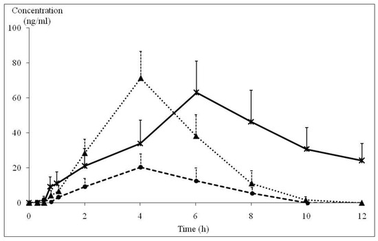 Area under the blood concentration and time profiles (AUC, ng∙h/mL) was calculated by using the Phoenix WinNonlin program (Pharsight, Mountain View, CA, USA) by noncompartment methods. The maximum concentration (Cmax, ng/mL) and time to Cmax (Tmax, h) were obtained directly from the blood concentration and time profiles. Elimination rate constant (Ke, h−1) was obtained from the slope of log-linear regression of elimination range of blood concentration-time profile. Half-life (T1/2, h) was calculated following the equation 0.693/Ke. Statistical analyses were performed using SPSS version 17.0 (SPSS, Inc., Chicago, IL, USA). The Kolmogorov-Smirnov test was used to determine the normal distribution of the data. The data were normally distributed. Paired t-test and one-way ANOVA with LSD multiple comparison were used for testing of significant difference within and between groups, respectively; p-values less than 0.05 were considered statistically significant.