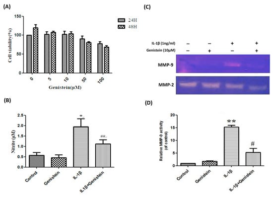 Genistein suppressed IL-1β-induced NO production and enzyme activity while preventing the IL-1β-mediated induction of MMP-9. (A) The cytotoxicity of genistein on human chondrocytes was evaluated using MTT assays. For this, chondrocytes were incubated with genistein at various concentrations (0, 5, 10, 50, and 100 μM/mL) for periods of 24 or 48 h. (B) Human chondrocytes were stimulated using IL-1β for 24 h prior to treatment with genistein. The production of NO was determined using the Griess reaction. (C) The release of MMP-2 and MMP-9 into cell culture supernatants was assessed using gelatin zymography. (D) MMP-9 activity was quantified using Alpha EaseFC software. Results are presented as mean ± SD (Obtained from at least three independent experiments). Significance was determined using a t-test. Significant differences between the genistein group and the control group are indicated by an asterix (*); significant differences between the genistein group and the IL-1β group are indicated by a pound symbol (#). *, # p < 0.05; **, ## p < 0.01.