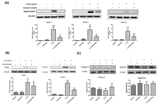 Western blot analysis was used to evaluate the effects of genistein on the release of MMP-1, MMP-3, and MMP-13 into the extracellular matrix. For this, supernatant was collected from the cell culture after stimulating the chondrocytes with 10 μM/mL genistein and 1 ng/mL IL-1β for 24 h. Following the addition of IL-1β alone, we observed a significant increase in MMP-1, MMP-3, and MMP-13 levels, compared with the control group (p < 0.01; p < 0.05; p < 0.01, respectively). Conversely, treatment with IL-1β in conjunction with 10 μM/mL genistein resulted in a significant decrease in MMP-1, MMP-3, and MMP-13 levels (p < 0.05; p < 0.05; p <0.01, respectively) (Figure 2A). We also evaluated NOS2 oxidative stress and the COX-2 inflammatory index. Under the same experimental conditions, the addition of IL-1β alone resulted in a significant increase in the expression of NOS2 and COX-2 (p < 0.05; p < 0.001, respectively) compared with the control group, whereas treatment with IL-1β in conjunction with 10 μM/mL genistein resulted in a significant decrease in NOS2 and COX-2 (p < 0.001 and p < 0.001, respectively) (Figure 2B). Nonetheless, we did not observe significant differences in proteins related to the extracellular matrix, such as aggrecan or collagen II (Figure 2C).