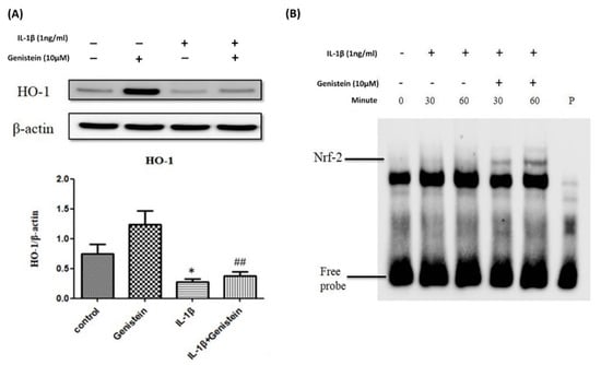 Genistein affected IL-1β-stimulated Nrf2/HO-1 signaling pathways in chondrocytes. (A) Human chondrocytes were stimulated using IL-1β and then treated with genistein for 24 h. HO-1 protein expression was quantified using Image J software. (B) Nuclear extracts of chondrocytes were treated with IL-1β in the presence of solvent or various doses of genistein for 24 h before the DNA-binding activity of Nrf-2 was analyzed using EMSA. P: probe only; Results are presented as the mean ± SD from no more than three independent experiments. Significance was determined using a t-test. Significant differences between the genistein group and the control group are indicated by an asterix (*); significant differences between the genistein group and the IL-1β group are indicated by a pound symbol (#). * p < 0.05; ## p < 0.01.