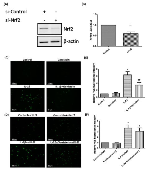 Chondrocytes were transfected with siRNA targeting siGENOME SMARTpool NFE2L2 (Nrf2) using DharmaFECT (Dharmacon, Lafayette, CO, USA) in accordance with the manufacturer’s instructions. Nontargeting siRNA was used as a negative control. Following transfection for 48 h, cells were exposed to genistein or IL-1β for the indicated times. The effects of siRNA on Nrf2 expression were assessed using Western blot analysis and by measuring intracellular ROS levels []. For this, we incubated 1 × 104 cells/well overnight at 37 °C under 5% CO2 in an incubator. The cells were then exposed to genistein or IL-1β for the indicated times, followed by incubation with 20 μM/mL DCFH-DA (sigma) at 37 °C for 30 min. Following treatment, the cells were washed using PBS, and fluorescence intensity was observed using a microscope (Olympus, Tokyo, Japan). ROS fluorescence intensity was evaluated using Image J software.