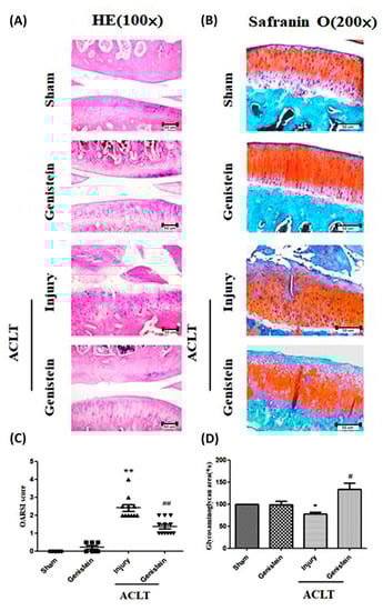 Our in-vitro results revealed that genistein inhibited IL-1β-induced signaling, thereby preventing the degradation of cartilage matrix and inhibiting inflammation. The anti-inflammatory activity of genistein was evaluated in vivo using an anterior cruciate ligament transection (ACLT) rat model. For this, 8-week-old rats underwent ACLT surgery, which involved cutting and suturing the anterior cruciate ligament. After three months of treatment, articular cartilage in the sham group appeared to be severely worn. Conversely, articular cartilage in the group treated with genistein (40 mg/kg) appeared smooth (Figure 5A). Moreover, OARSI scores of animals treated with genistein were significantly lower than those of the ACLT injury group (p < 0.01) (Figure 5C). Safranin O staining further revealed the loss of GAG, wherein the sham group presented lower GAG levels than did the injury group (p < 0.05). Finally, we observed that GAG levels in the genistein group were significantly higher than in the ACLT Injury group (Figure 5B). Specifically, GAG positive staining in the ACLT genistein group covered a significantly larger area than in the ACLT Injury group (p < 0.05) (Figure 5D).