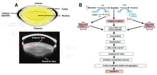 Animal models such as the streptozotocin (STZ) rat, a model used to chemically induce Type 1 diabetes by destroying pancreatic betacells, and galactose fed animals, a model for obese Type 2 diabetes, have been used to understand the mechanisms of diabetic cataract formation. These models have been commonly used because diabetes or galactosemia can be induced rapidly and effectively resulting in formation of “fast” sugar lens cataract. From these animal studies, the consensus view was that high levels of the impermeable osmolyte, sorbitol, produced from excess glucose by the enzyme aldose reductase (AR), initiates osmotic stress, resulting in the attraction of fluid, lens fiber cell swelling and tissue liquefaction [,,]. Based on this view, considerable attention was focused on the development and testing of AR inhibitors, which were proven to be very successful in ameliorating diabetic cataract in rats and dogs [], but ineffective in humans. The failure of aldose reductase inhibitors to slow the progression of cataract in humans lies with the differences in AR activity and polyol accumulation between rats and humans, with humans exhibiting low levels of AR activity relative to rat. In addition, the acute animal models replicate the fast development of cataract that occurs in diabetic patients with uncontrolled hyperglycemia. However, most diabetic patients are able to control their blood glucose reasonably well and so such acute cataract development is rarely seen. Instead, the majority of adult diabetic patients typically develop cataract after having suffered from diabetes for several years. Therefore, while the initiating mechanism in the development of diabetic cataract is osmotic stress, it is now believed that oxidative stress generated by polyol pathway activity [], impairs the ability of the lens over time to regulate its volume, resulting in slow developing cataract formation []. This suggests that osmotic and oxidative stress work synergistically to cause a loss of cell volume and tissue liquefaction in the lens cortex (Figure 1B).