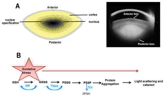 Nuclear cataracts. (A) Location of the nuclear cataract subtype. Left panel: diagram showing the opacities that form in the lens nucleus. Right panel: Scheimpflug slit-lamp photographic image revealing a nuclear cataract. (B) Molecular mechanisms involved in the pathogenesis of age-related nuclear cataract. GSH levels are maintained at high levels within the lens by a combination of pathways including regeneration of oxidised GSH (GSSG) back to GSH via the enzyme glutathione reductase (GR) as well as repair enzymes thioltransferase (Ttase), which dethiolate protein mixed disulfides, such as protein bound GSH (PSSG), and thioredoxin (TrX), that dethiolates protein-protein disulphides (PSSP). In age related nuclear cataract, depletion of GSH levels in the nucleus, but not the lens cortex, results in significant oxidation of nuclear proteins, an increase in protein mixed disulphides, formation of protein-protein disulfide bonds, protein aggregation, loss of protein solubility, increased yellowing of the lens nucleus, and eventual nuclear cataract formation.