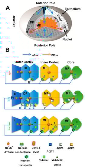 The transparency of the lens is closely linked to the unique structure and function of its fiber cells. These highly differentiated cells are derived from equatorial epithelial cells, which exit the cell cycle and embark upon a differentiation process that produces extensive cellular elongation, the loss of cellular organelles such as mitochondria and nuclei, and the expression of fiber-specific proteins [,]. Fiber cells elongate until fibers from opposite hemispheres meet at the poles and interdigitate to form the lens sutures []. Since this process continues throughout life, a gradient of fiber cells at different stages of differentiation is established around an internalized core (nucleus) of mature, anucleate fiber cells that were laid down in the embryo (Figure 3A). While the transparent properties of the lens are a direct result of its highly ordered tissue architecture, the lens is not a purely passive optical element. Maintenance of its architecture requires special mechanisms not only to supply the deeper lying fiber cells with nutrients, but also to control the volume of these cells. Because of its size, the avascular lens cannot rely on passive diffusion alone to transport nutrients and antioxidants from the surrounding humours to deeper lying cells, or to transport waste products back to the surface. Instead, it has been proposed that the lens operates an internal microcirculation system, which maintains lens transparency by delivering nutrients to the lens core faster than would occur by passive diffusion alone [,,].