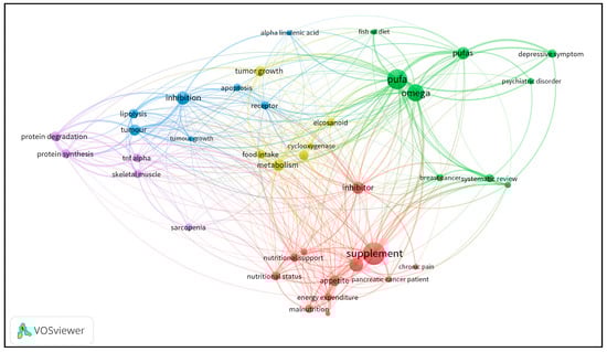 With the aim of visualizing the existing evidence discussed in this review, we used the VOSViewer software (Leiden University, Netherlands) to build a co-occurrence network of terms, based on publications retrieved from PubMed, using the following keywords: “cancer pain”, “cancer depression”, “cancer cachexia”, and “paraneoplastic syndrome”, each combined with “omega-3”. From the database, containing data of about 297 articles (original and review articles), VOSViewer extracted the most relevant and repeated terms in the retrieved publications (considering title, keywords, and abstract). To be considered, a term had to appear in at least 10 articles.
