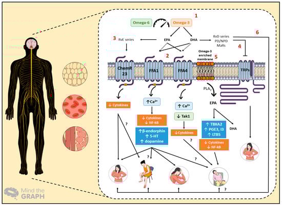 Omega-3 PUFAs are classified as essential because they cannot be synthesized by the organism; hence, the consumption of food rich in omega-3, such as fish from cold waters, nuts, and seed oils, is mandatory [4]. The beneficial effects of omega-3 PUFA consumption are likely related to its anti-inflammatory and pro-resolution effects, mainly due to the inhibition of nuclear factor kappa B (NF-κB) and the production of pro-resolution mediators, such as resolvins, protectins, and maresins [5,6]. More recently, two G protein-coupled receptors, called Free Fatty Acid Receptor 1 (FFA1) and Free Fatty Acid Receptor 4 (FFA4), were identified as molecular targets for omega-3 PUFAs [7,8]. When activated, these receptors can promote a number of effects, such as improving the insulin sensibility, inducing adipose tissue browning, promoting analgesia by the release of β-endorphin, controlling energy homeostasis, and diminishing food intake [9,10,11,12].